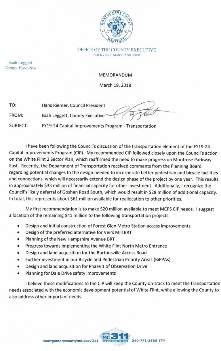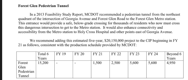 The County Council’s Transportation Committee voted 2-1 (Berliner, Hucker -YES, Floreen – NO) to approve funding for the Forest Glen 2nd entrance with the bulk of the $20 million being available FY21 and construction completed in FY25.